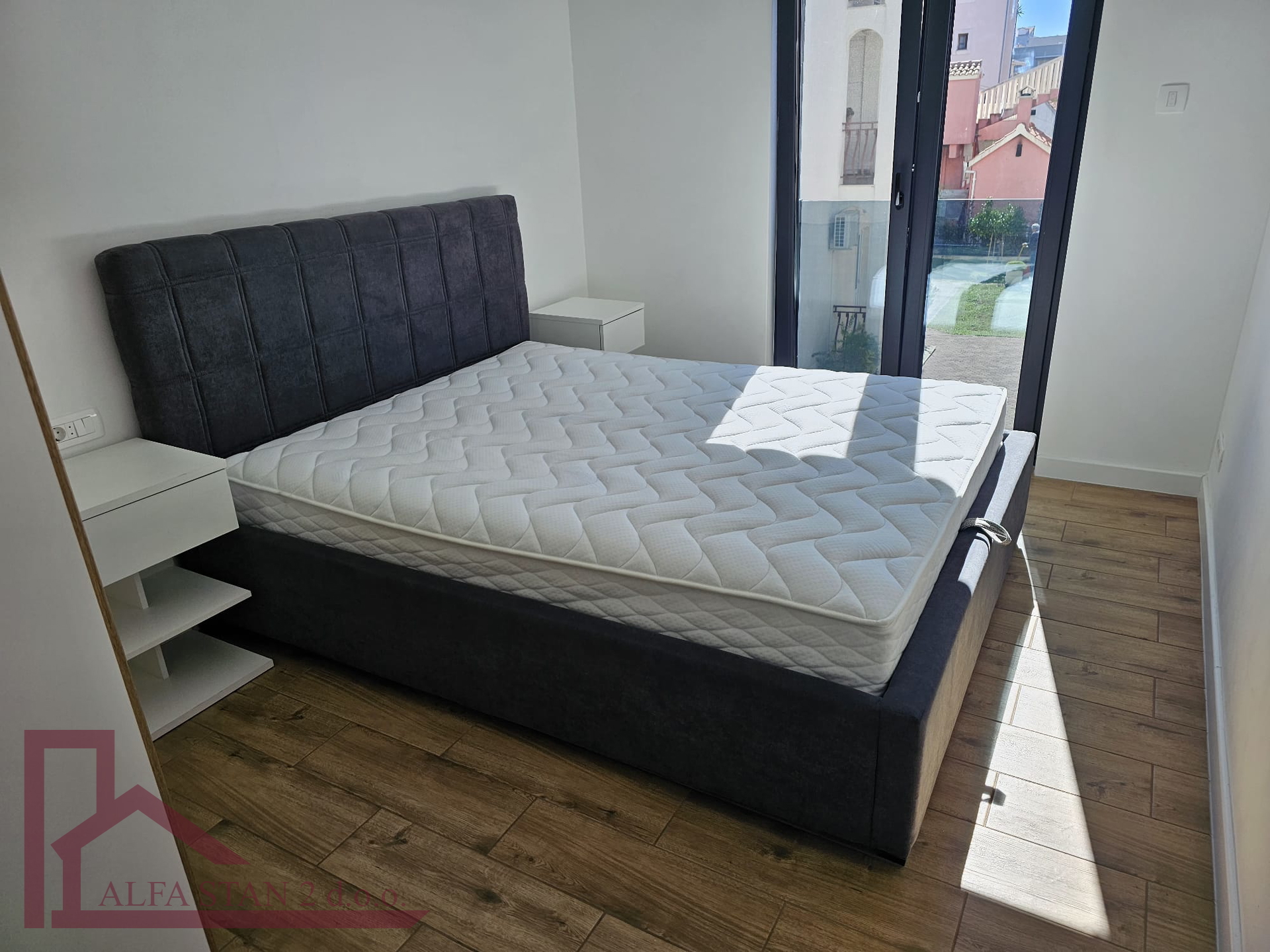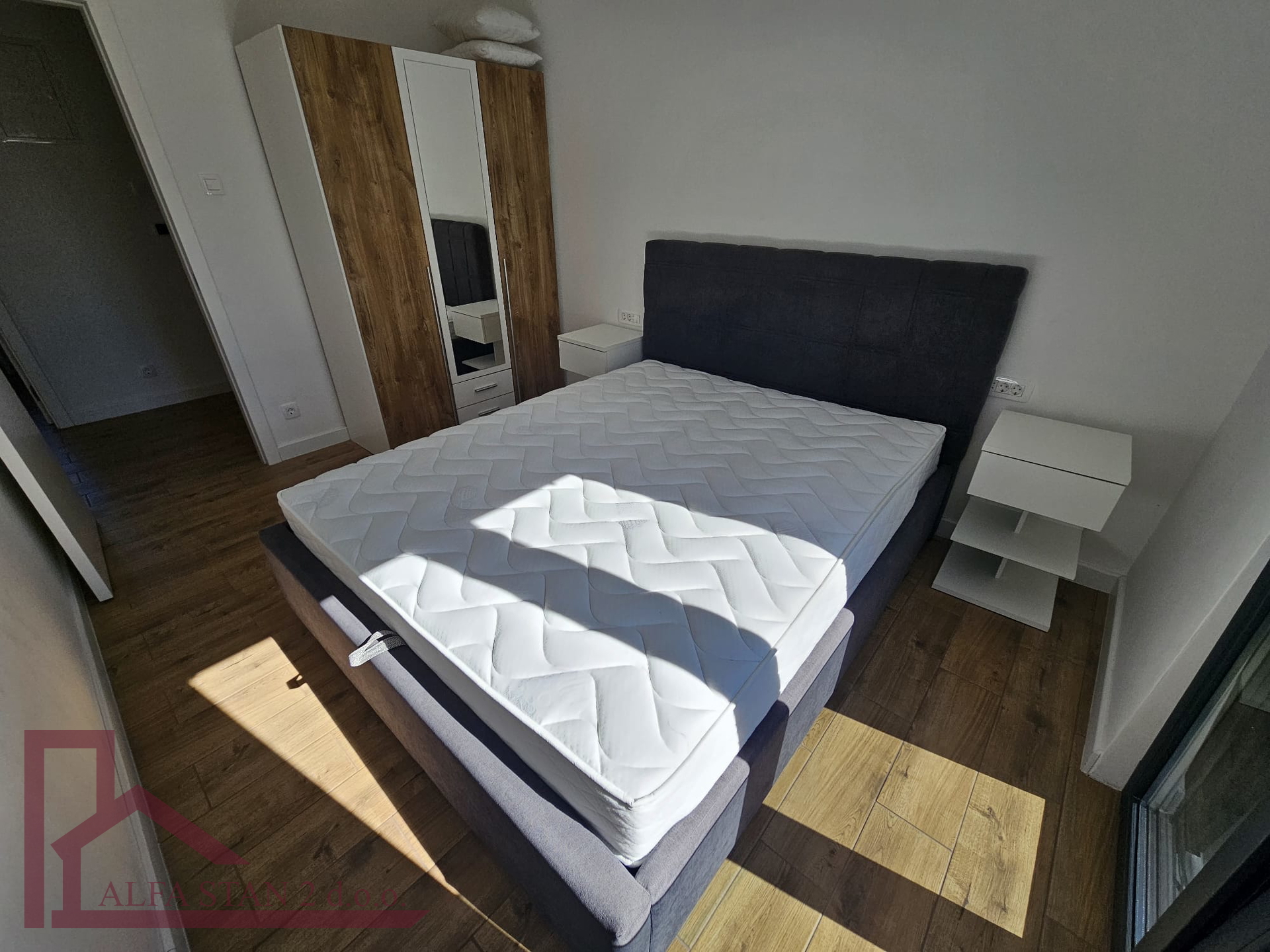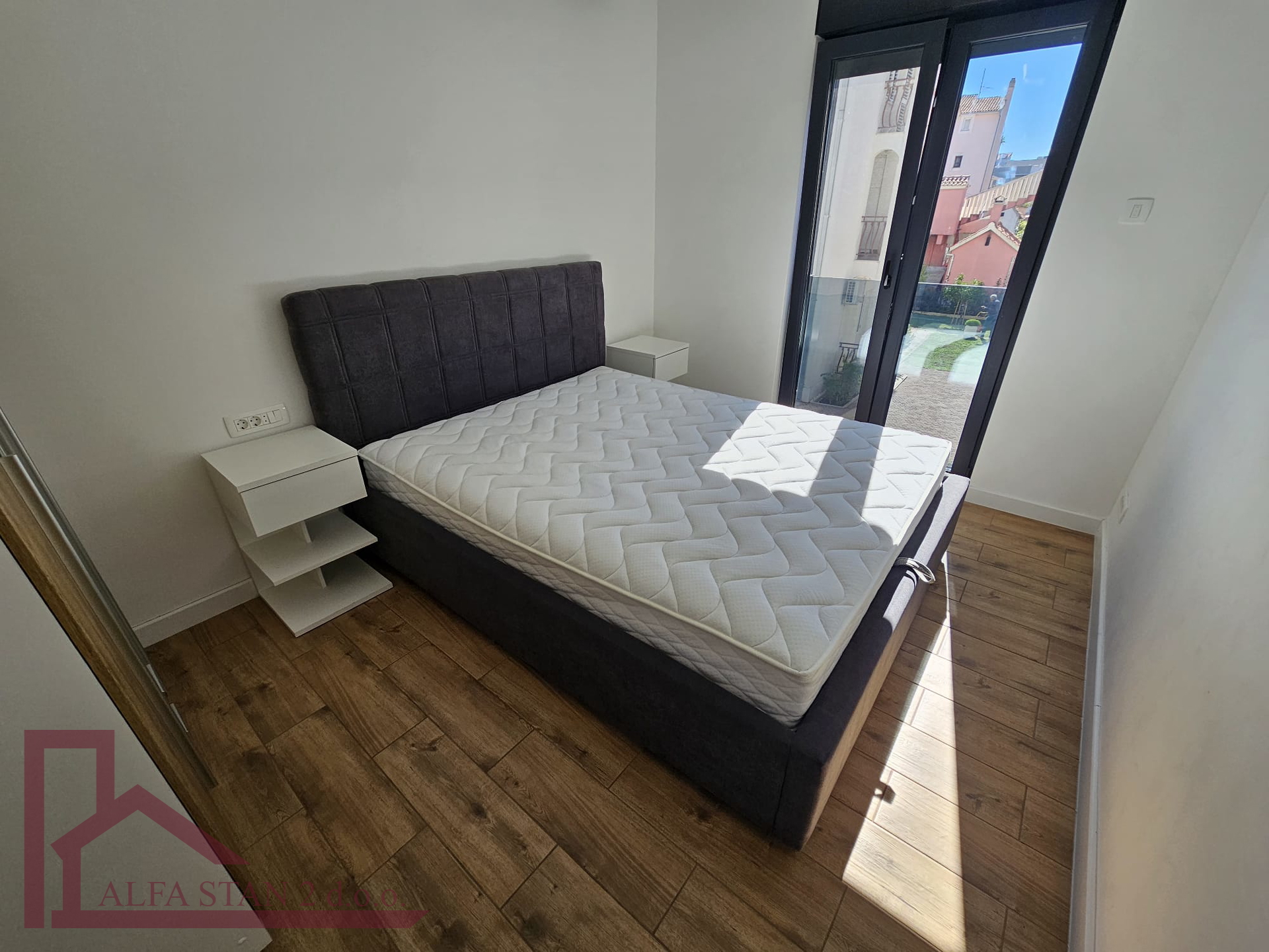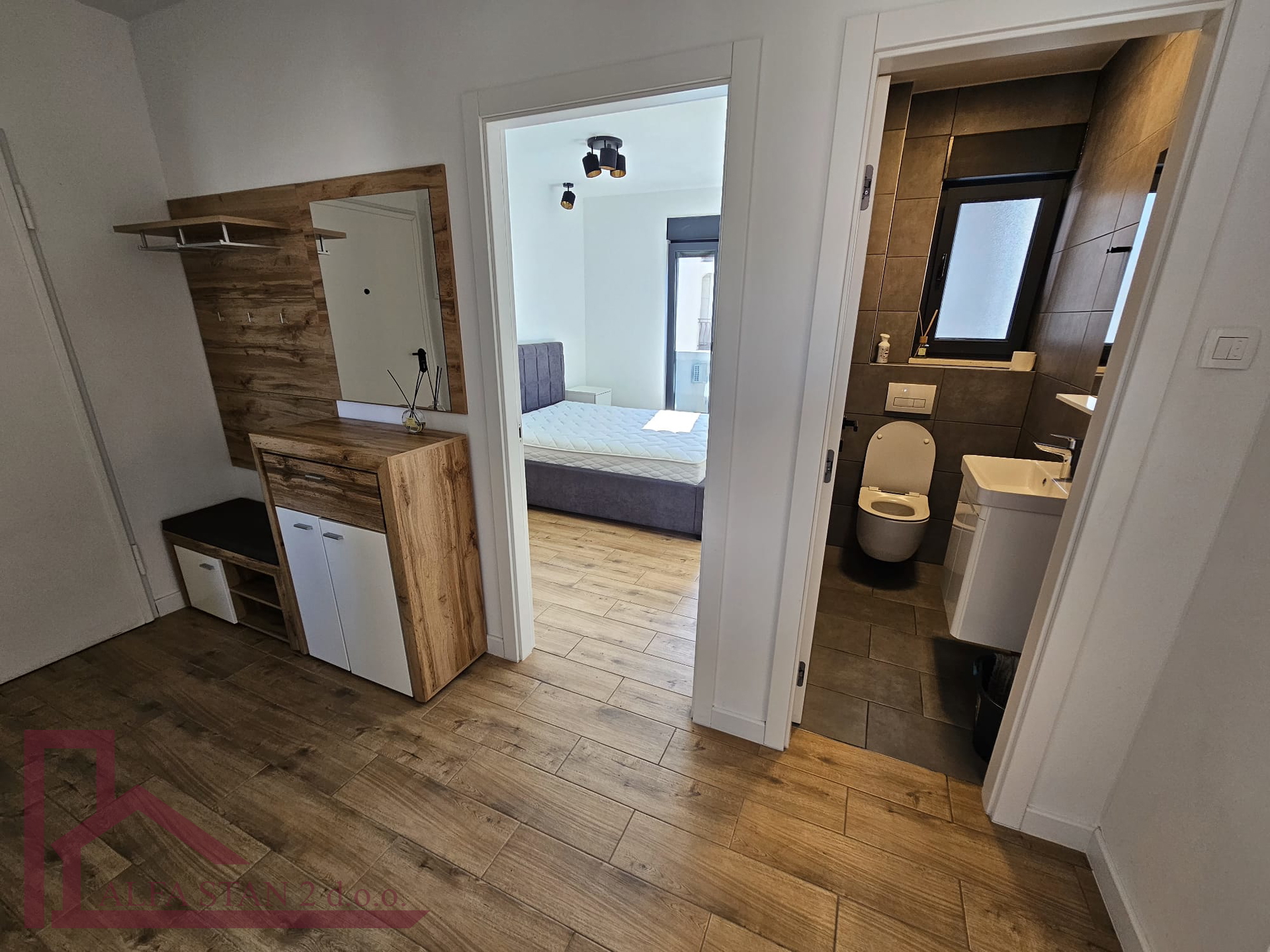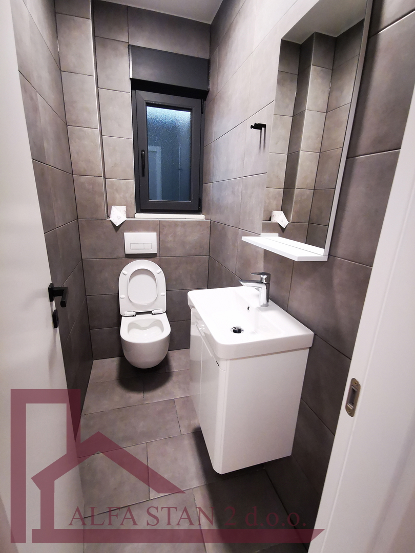 Kao agencija posredujemo u najmu lijepog dvosobnog stana koji se nalazi na 1. katu novoizgrađene zgrade. U stanu se nalazi hodnik iz kojeg se ulazi u wc, kupatilo wc, manju sobu sa krevetom na kat i bračnu sobu, a kuhinja s blagovaonom i dnevnim boravkom se nalazi u jednom prostoru s izlazom na lođu od 9 m2. U stanu je provedeno podno grijanje.