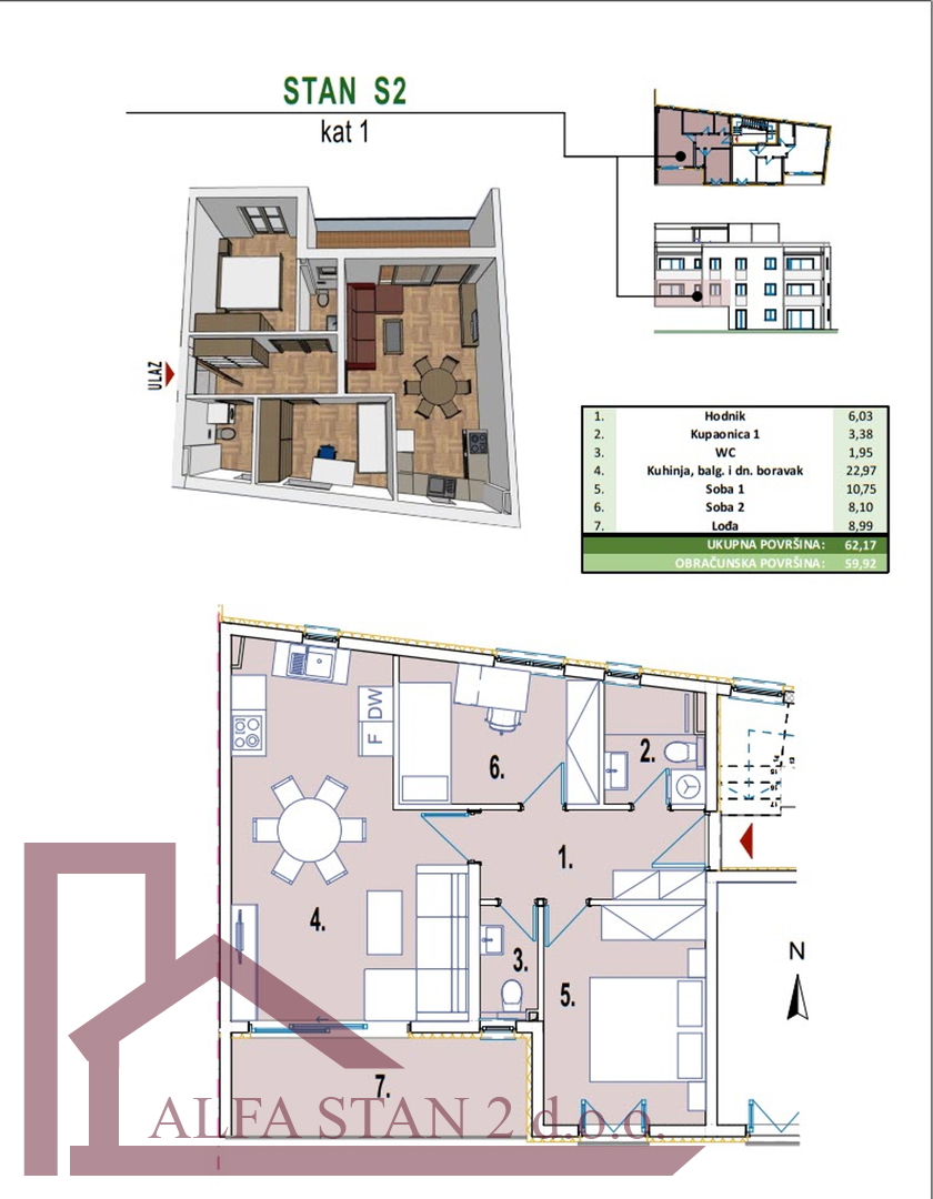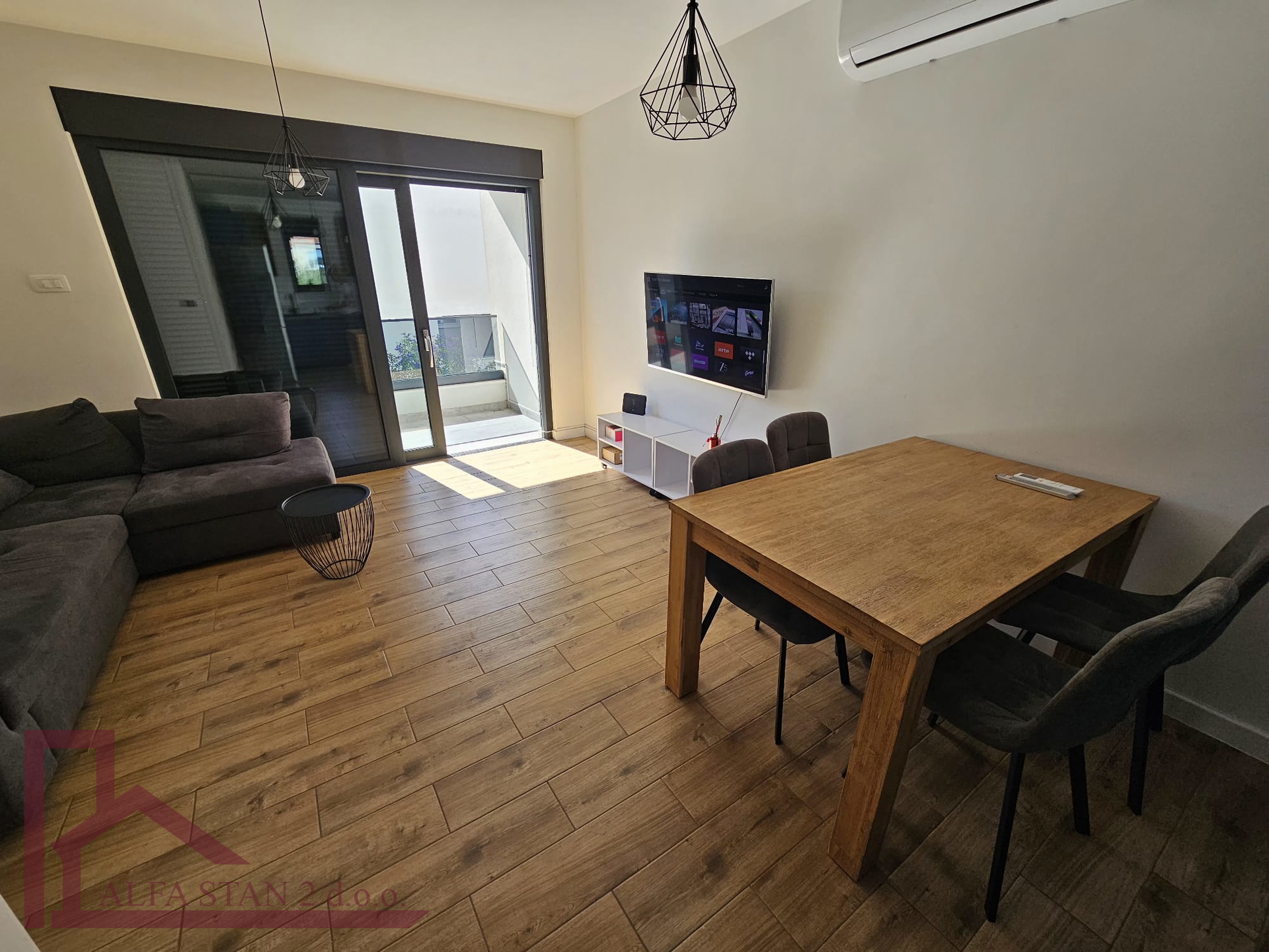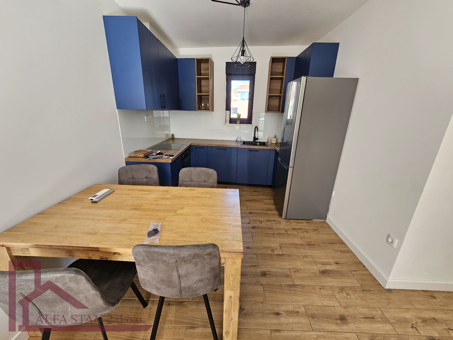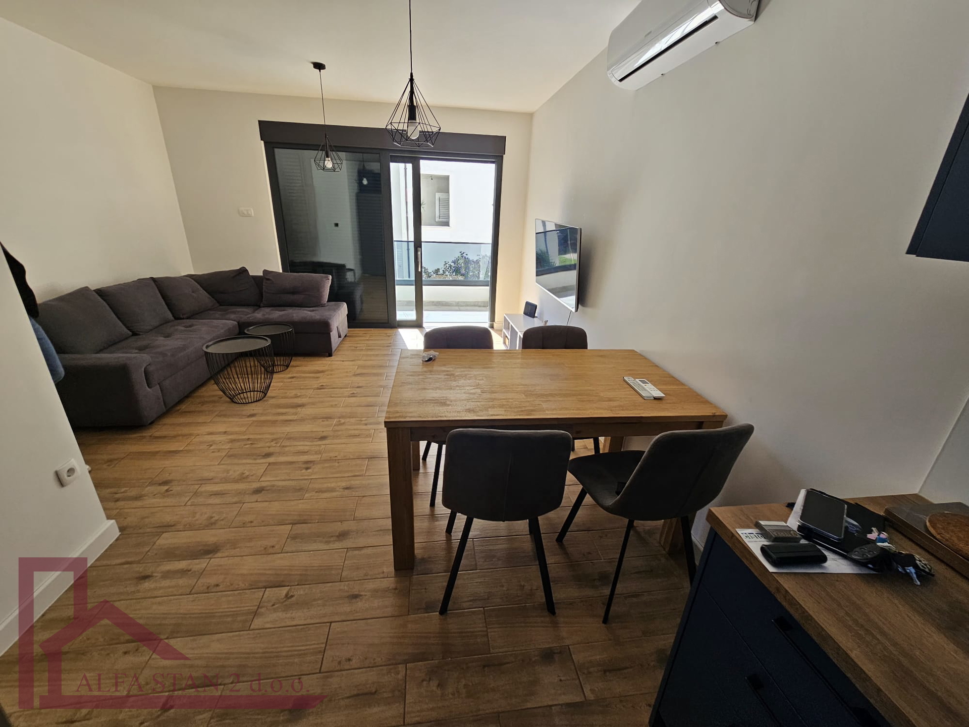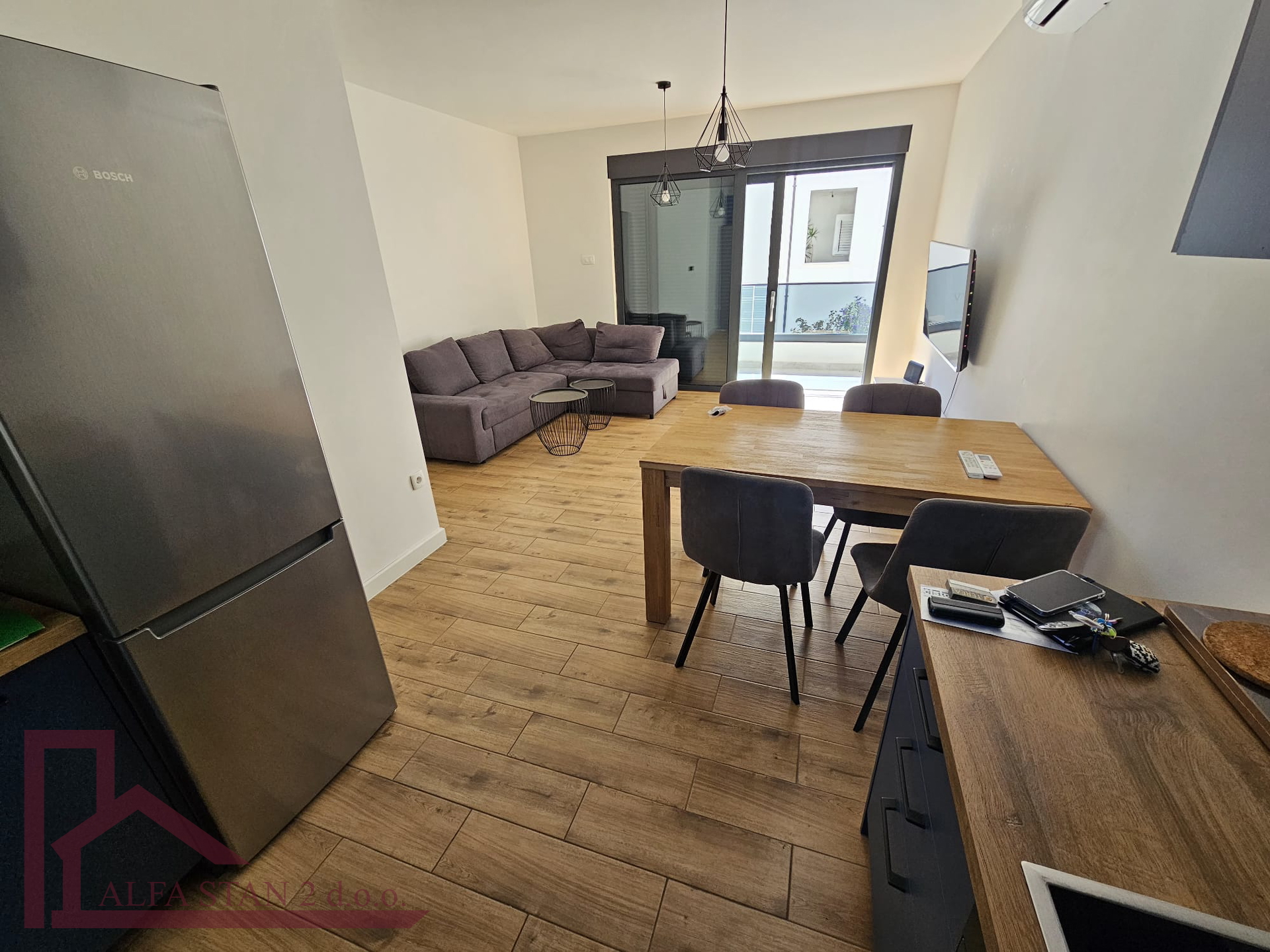 Kao agencija posredujemo u najmu lijepog dvosobnog stana koji se nalazi na 1. katu novoizgrađene zgrade. U stanu se nalazi hodnik iz kojeg se ulazi u wc, kupatilo wc, manju sobu sa krevetom na kat i bračnu sobu, a kuhinja s blagovaonom i dnevnim boravkom se nalazi u jednom prostoru s izlazom na lođu od 9 m2. U stanu je provedeno podno grijanje.