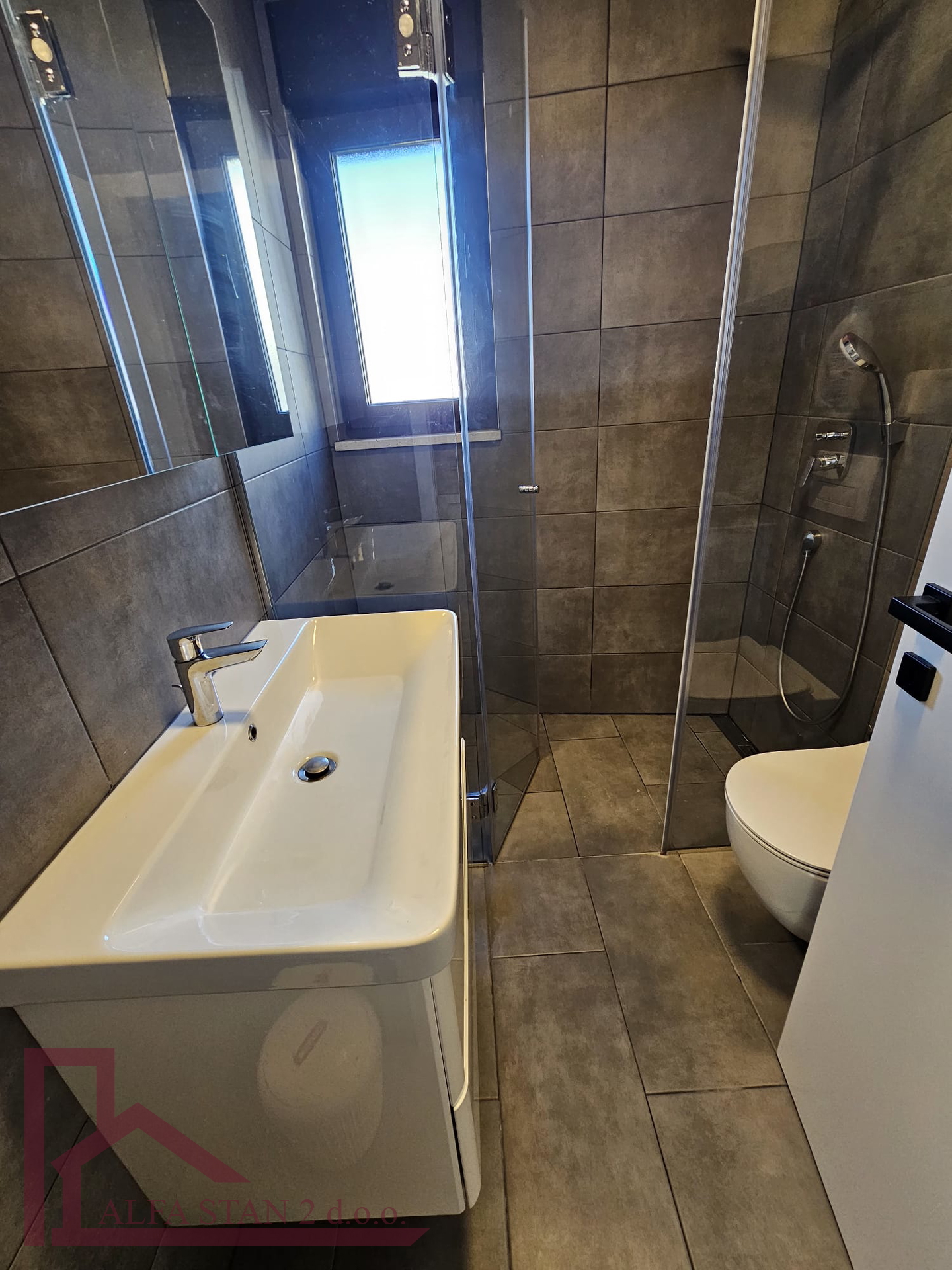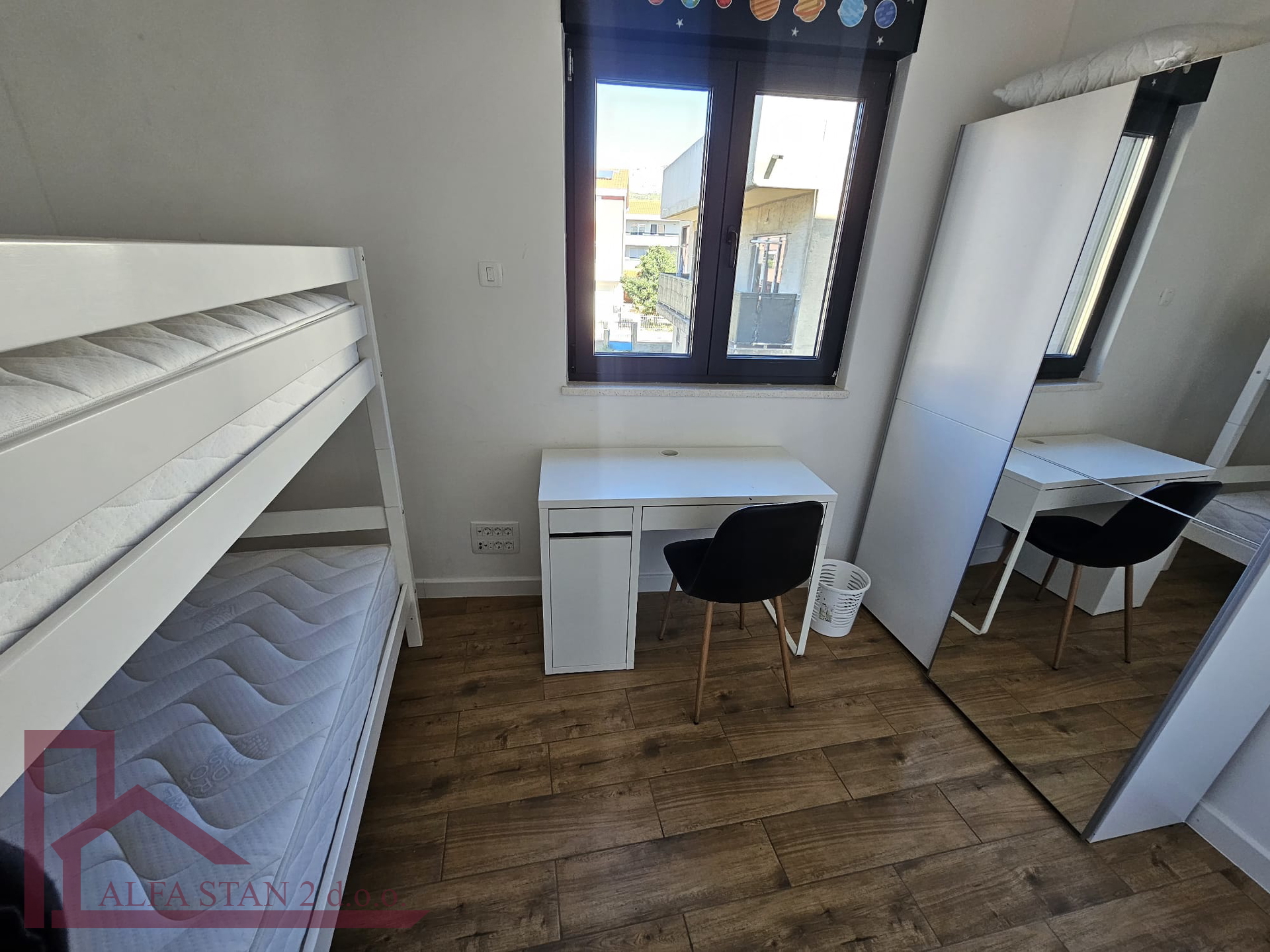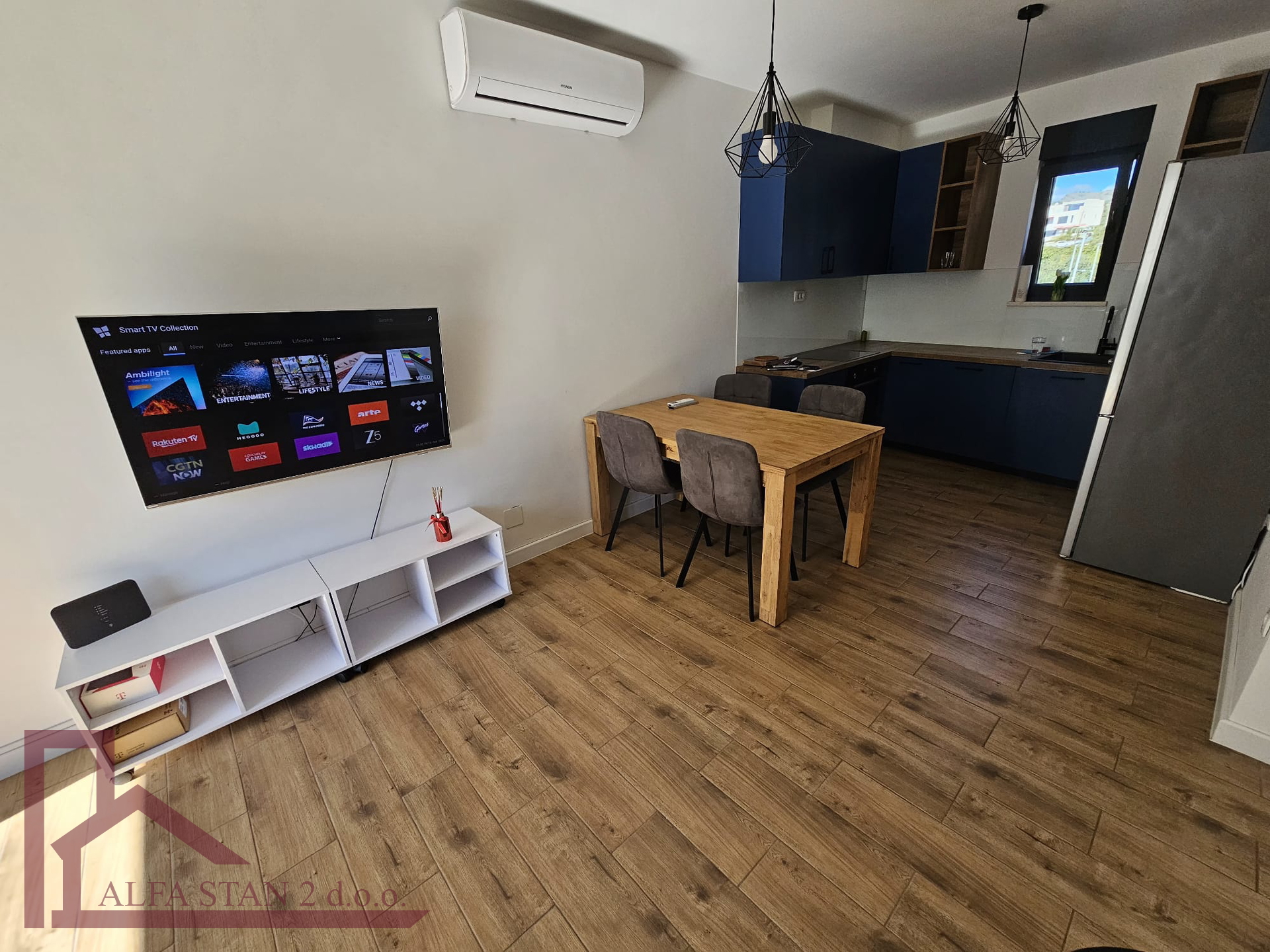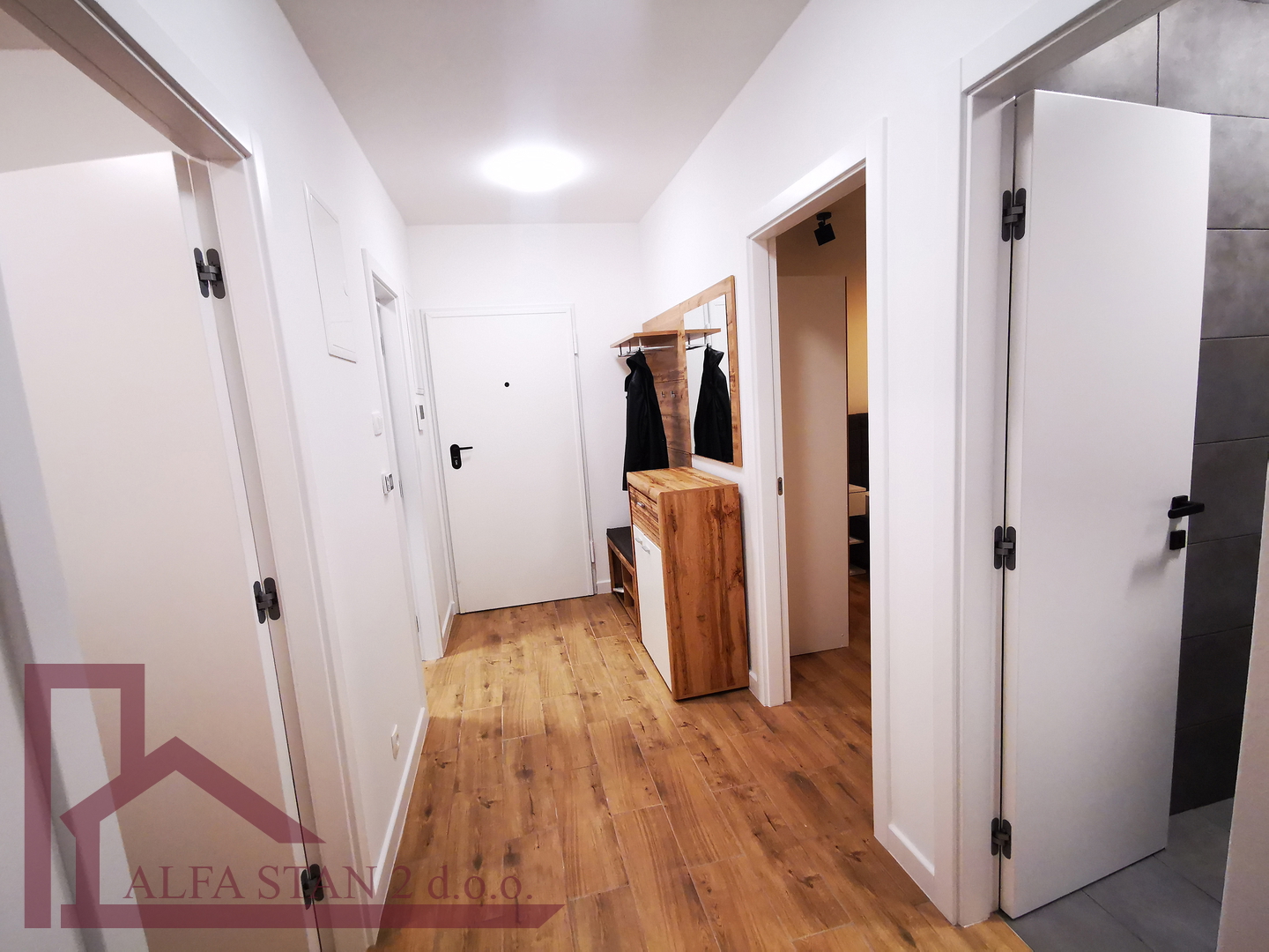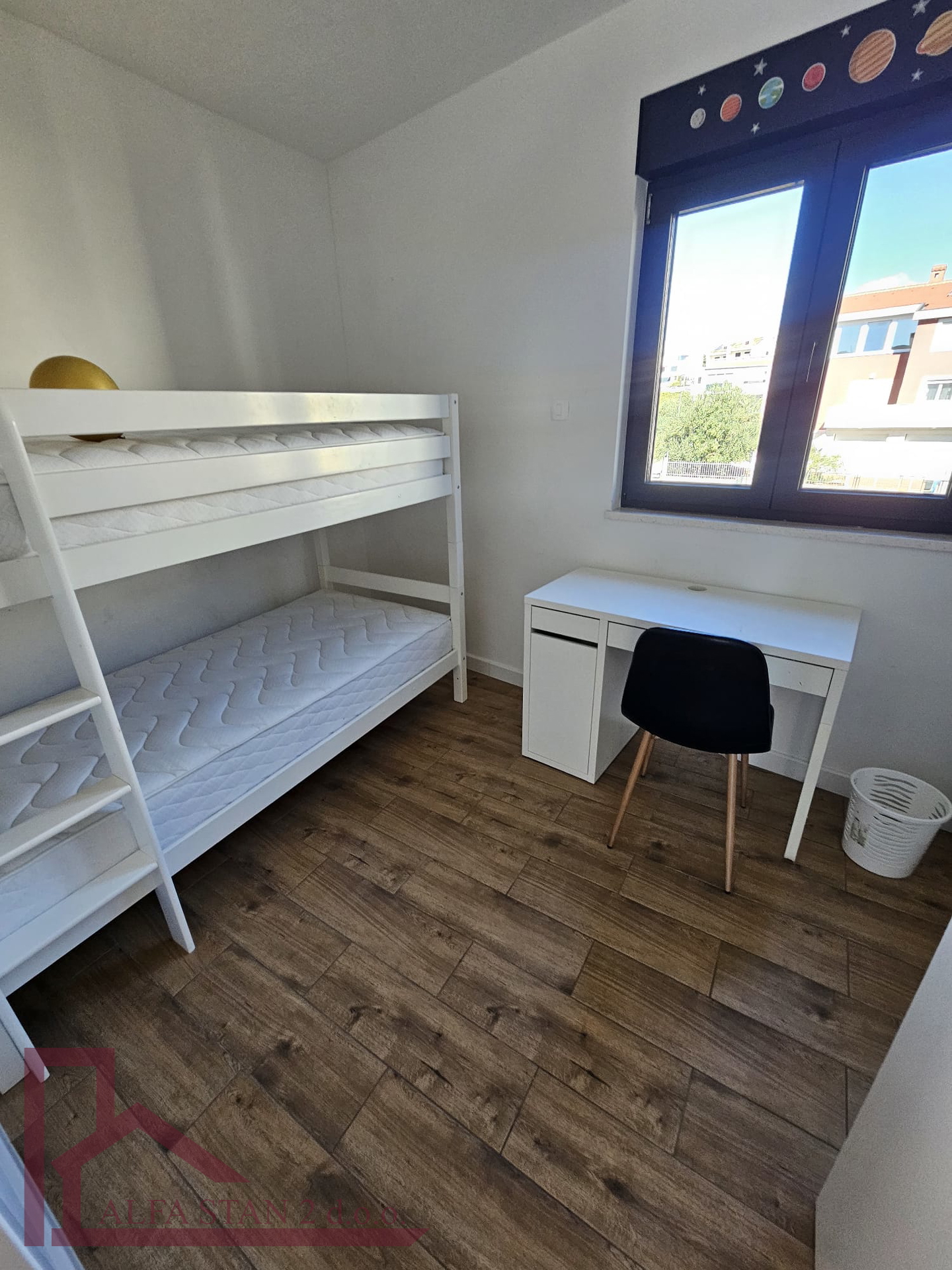 Kao agencija posredujemo u najmu lijepog dvosobnog stana koji se nalazi na 1. katu novoizgrađene zgrade. U stanu se nalazi hodnik iz kojeg se ulazi u wc, kupatilo wc, manju sobu sa krevetom na kat i bračnu sobu, a kuhinja s blagovaonom i dnevnim boravkom se nalazi u jednom prostoru s izlazom na lođu od 9 m2. U stanu je provedeno podno grijanje.