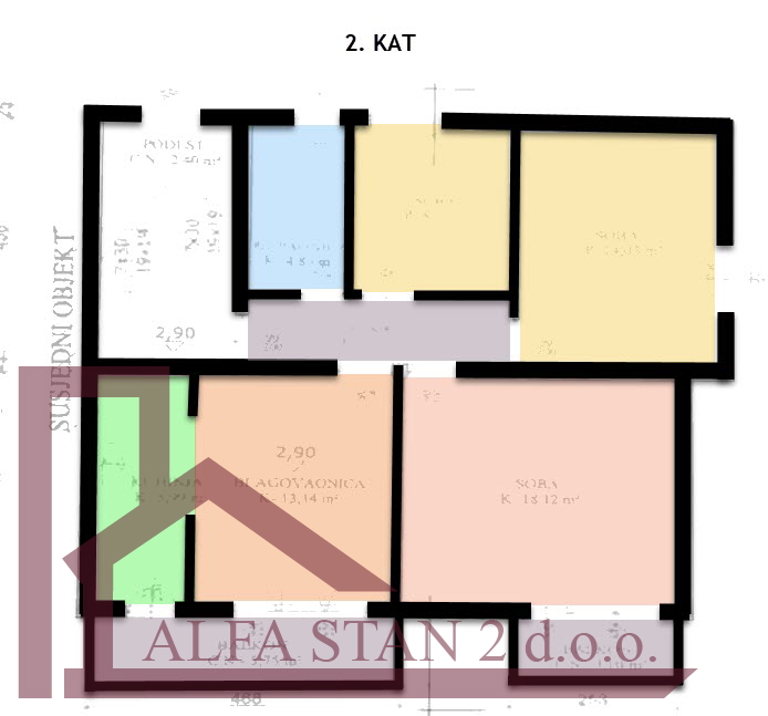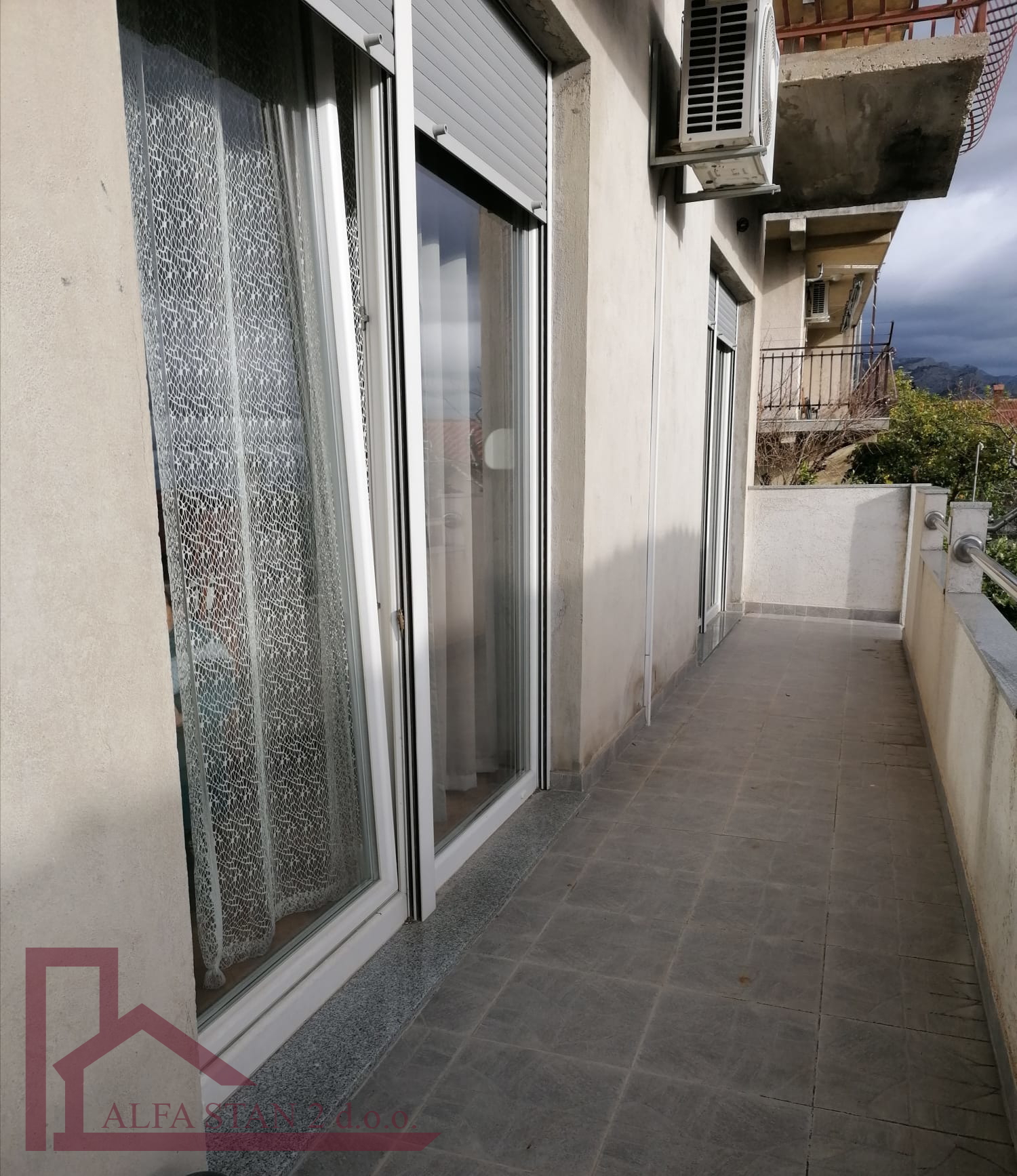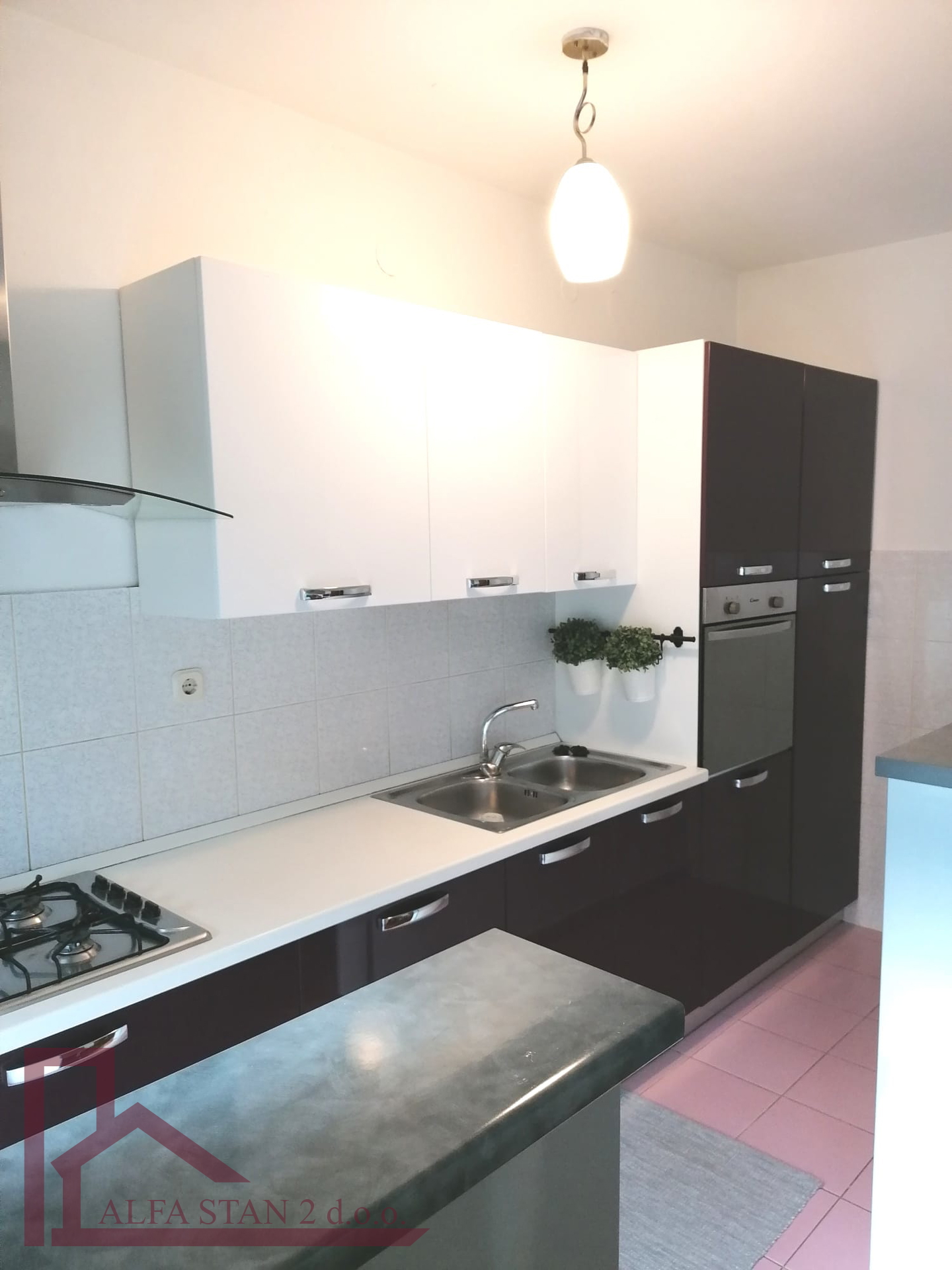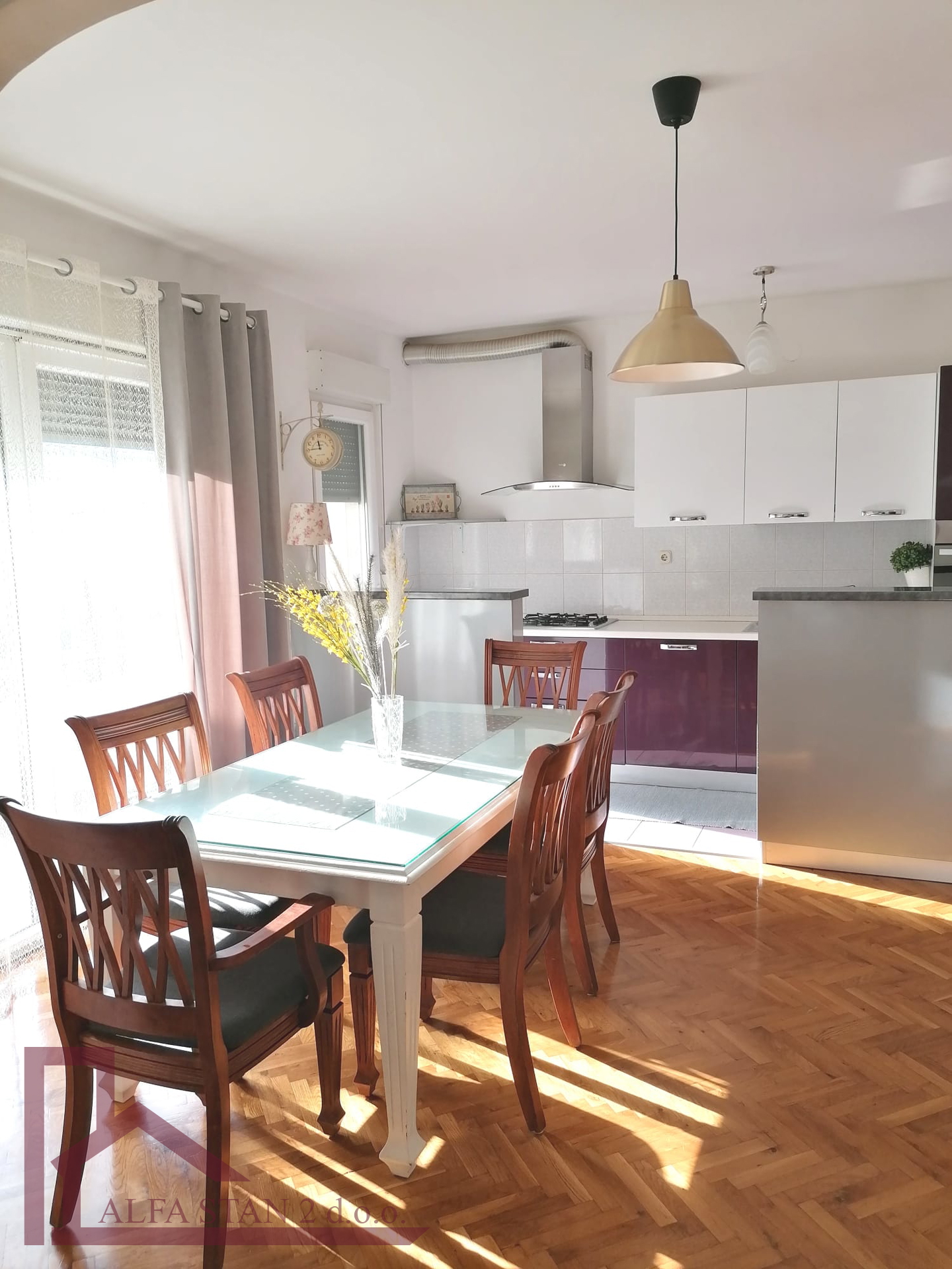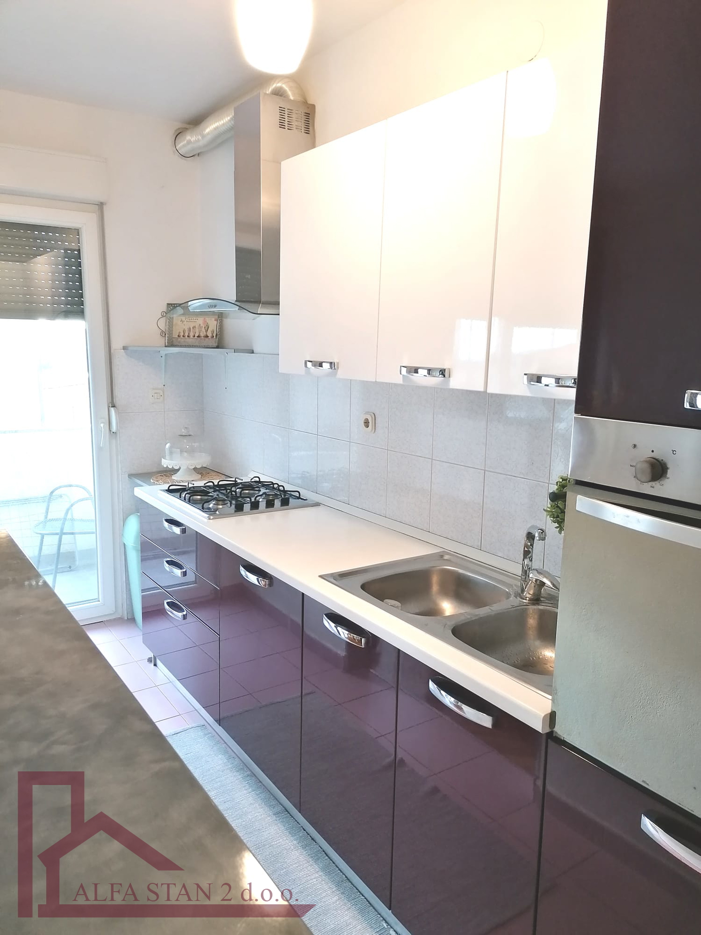 Raspored: hodnik, dvije spavaće sobe, kupatilo, kuhinja s blagovaonicom i izlazom na balkon (6 m2), te odvojeni dnevni boravak s dodatnim balkonom (3 m2).