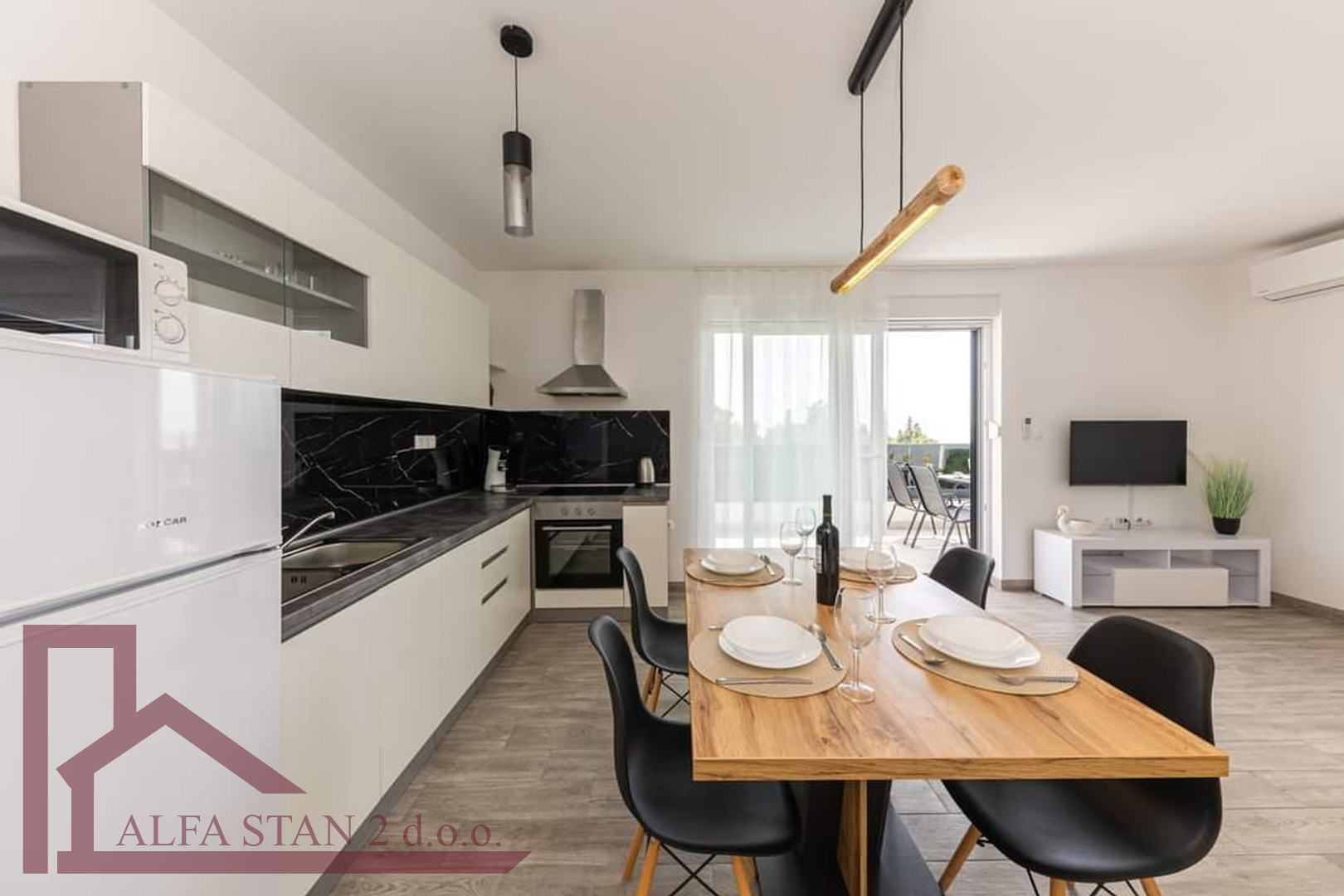 Opremljena kuhinja s modernim aparatima i dnevni boravak s izlazom na terasu